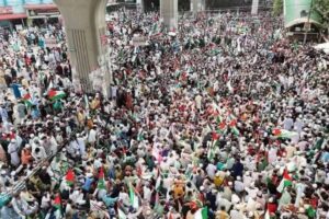 ফিলিস্তিন, ভারত, রোহিঙ্গা মুসলিমসহ বিশ্বের নিপীড়িত মুসলমানদের পক্ষে সংহতি জানাতে শনিবার (২৬ এপ্রিল) রাজধানীর জাতীয় প্রেসক্লাব এলাকায় প্রায় অর্ধলাখ মানুষের জমায়েত হয়। এতে ভোর থেকে বেলা সোয়া ১১টা পর্যন্ত প্রেসক্লাবের আশপাশের সড়কগুলোতে যান চলাচল বন্ধ হয়ে যায়।