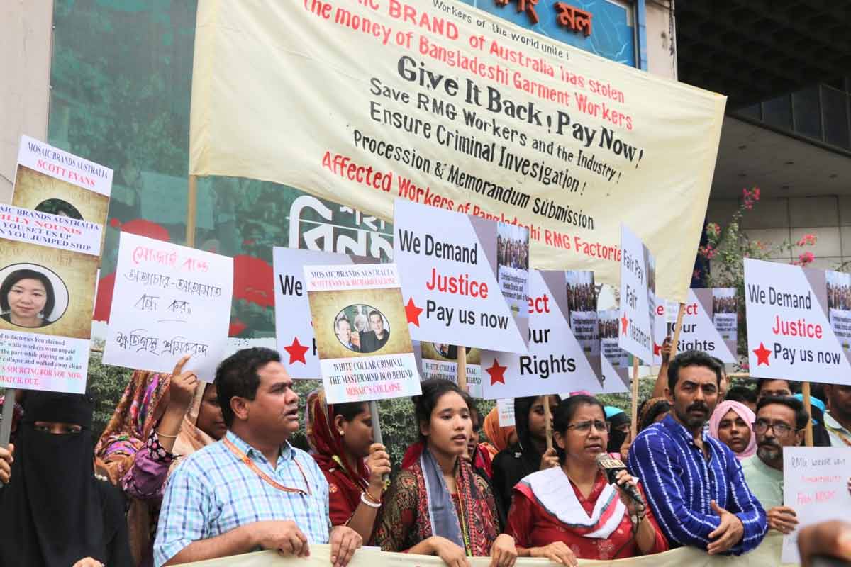 এছাড়া সমাবেশে বাংলাদেশ গার্মেন্ট শ্রমিক সংহতির সভাপ্রধান তাসলিমা আখতার বলেন, অস্ট্রেলিয়ান কোম্পানি মোজাইক ব্র্যান্ডস লিমিটেডের প্রতারণামূলক ব্যবসার কারণে বাংলাদেশের ২২টি কারখানার শ্রমিকদের জীবন ও জীবিকা চরম অনিশ্চয়তার মধ্যে পড়েছে। গত তিন বছর ধরে মোজাইক ব্র্যান্ডস তাদের বকেয়া পরিশোধ না করায় জাস অ্যাপারেলস (ZAS Apparels) কারখানাটি বন্ধ হয়ে গেছে। সেইসাথে অন্য কারখানাগুলো মজুরি পরিশোধে ব্যর্থ হয়ে বন্ধ হওয়ার ঝুঁকিতে রয়েছে। তিনি অবিলম্বে কারখানাগুলোর পাওনা টাকা ফেরত আনা এবং ক্ষতিপূরণ প্রদানের পাশাপাশি মোজাইক ব্র্যান্ডসের বিরুদ্ধে ফৌজদারি তদন্ত শুরুর জন্য অস্ট্রেলীয় হাইকমিশনের কাছে আহবান জানান।